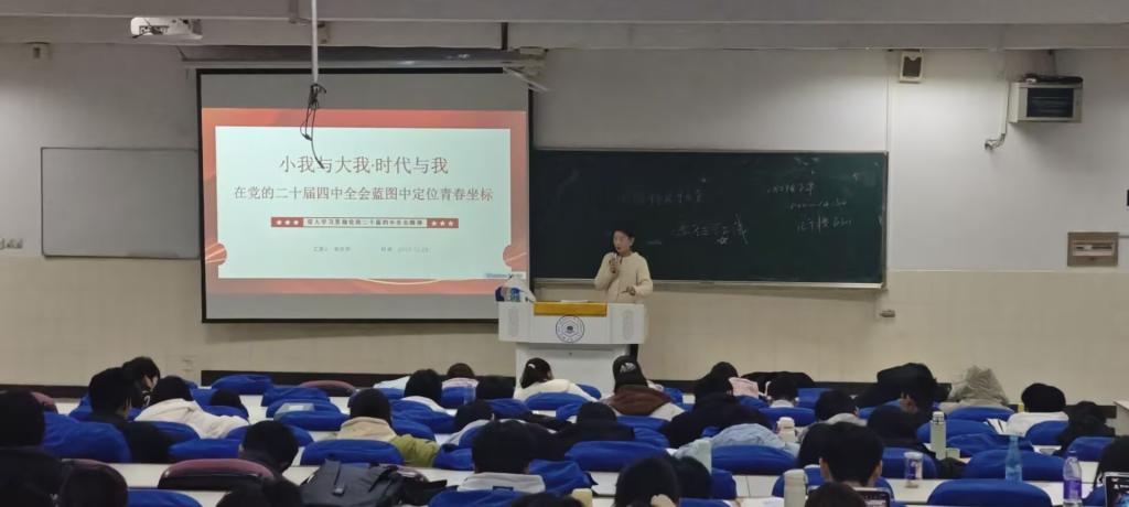 为深入学习贯彻党的二十届四中全会精神,切实把青年学子思想和行动统一到全会部署上来,引导大家在“十五五”规划开局关键期锚定青春航向、勇担时代使命,12月29日下午,第六届辅导员宣讲团成员周文潇走进太阳成集团tyc122ccvip,以“小我与大我・时代与我”为主题开展专题宣讲。学院各级学生代表、学生党员及班级骨干参加此次活动。