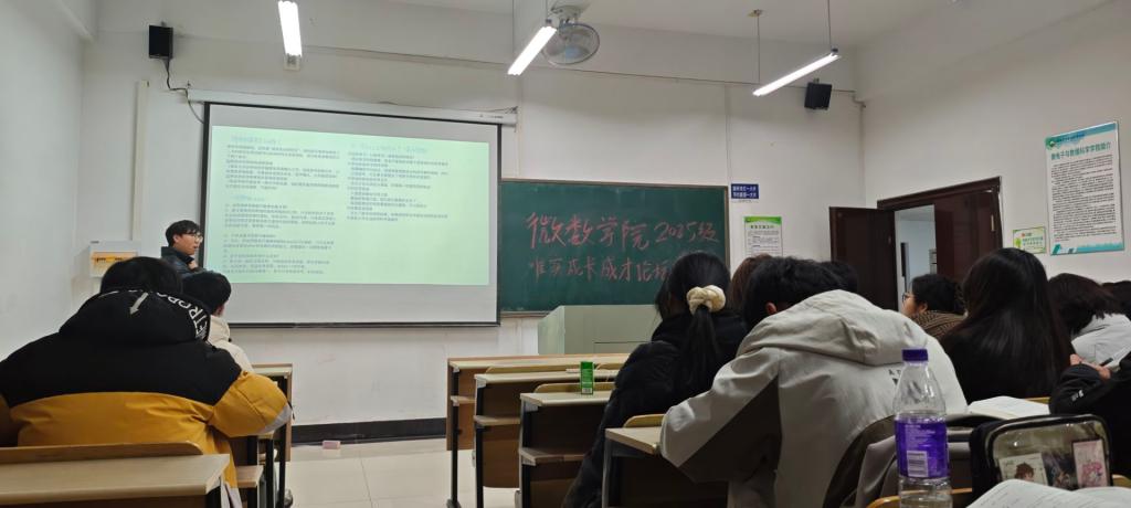 为充分发挥优秀学长学姐的榜样引领作用,帮助数学与应用数学专业25级新生明确学业方向,规划成长路径,12月29日晚,微数学院关工委联合学生工作办公室举办“唯实”学生成长成才论坛(第八期)。本次论坛特别邀请2022级数学与应用数学专业王武、晏萌萌担任主讲人,2025级数学专业新生全程参与,辅导员周文潇主持。