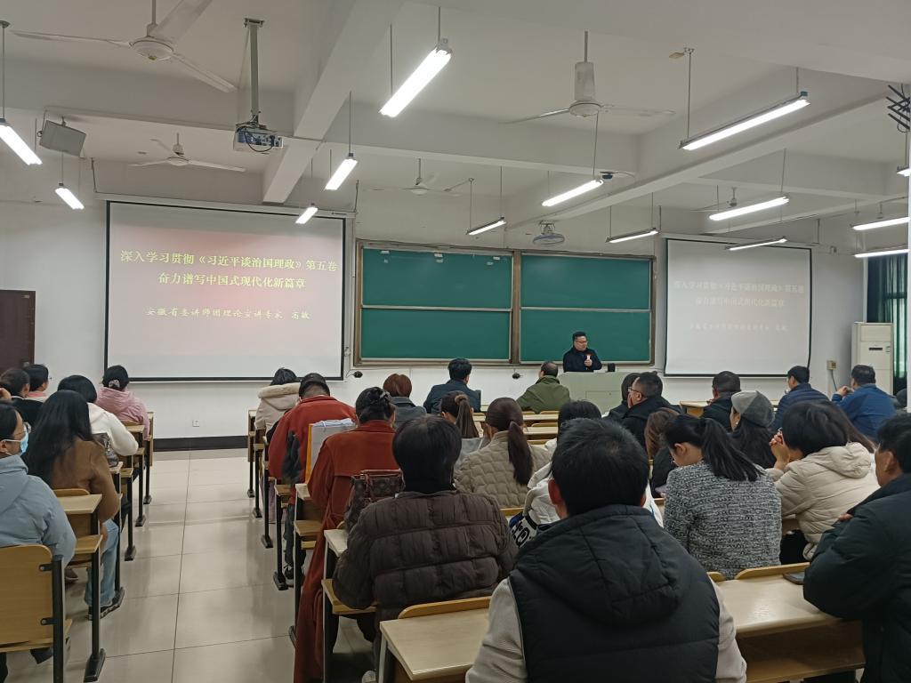 11月27日下午,太阳成集团tyc122ccvip举行《习近平谈治国理政》第五卷专题辅导报告会。会议邀请安徽省委讲师团高端宣讲专家、图书馆馆长高敏教授以《深入学习贯彻〈习近平谈治国理政〉第五卷,奋力谱写中国式现代化新篇章》为题作专题辅导。报告会在数理楼403室举行,全院教职工参会,会议由学院党委书记汪春胜主持。