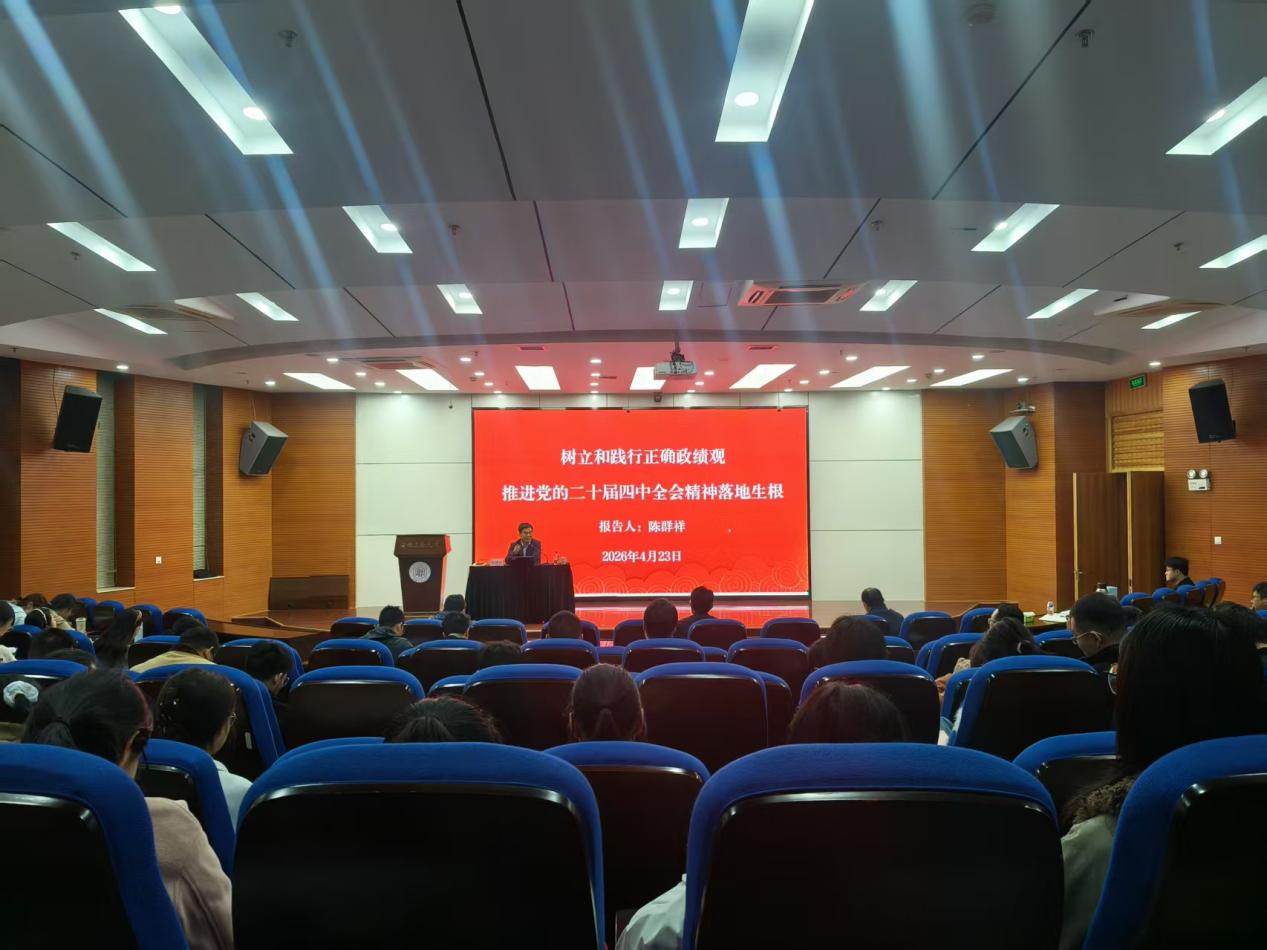 4月23日下午,太阳成集团tyc122ccvip党委、建筑工程学院党委在振华图书馆学术报告厅第一报告厅联合举办专题辅导报告会。邀请马鞍山市委党校现代科技与管理教研室副主任、教研名师、市首批“宣讲名家”陈群祥副教授作“树立和践行正确政绩观 推进党的二十届四中全会精神落地生根”专题辅导报告。两个学院的教职工党员、科级干部以及学生党员代表参加了报告会。